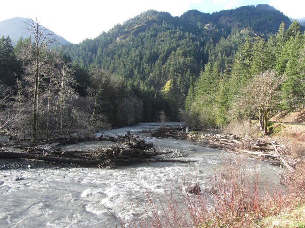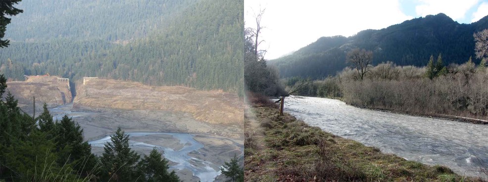 The Elwha River is a newly wild river not far west of Port Angeles. From the 1920s until 2012, the river was dammed for power generation and for the city's water supply, but it now flows freely. Already the salmon are returning. The water turns a milky glacial blue in flood as it shifts its channels and carries massive trees down to the strait.