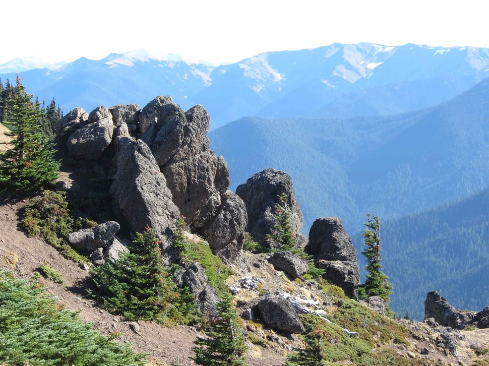 The hike to Klahane Ridge starting with the Switchback Trail can be a challenge, but a most rewarding one. The trail starts at a pull out along Hurricane Ridge Road, about ten minutes below the lodge. It starts steeply following a small creek. If you study the moist rocks by the trailside you might see butterworts, carnivorous plants, that prey on insects. The spikes with blossoms growing from the bogs are bog orchids, the source of that sweet smell. The trail heads into the umbrella forest where the unstable ground has turned the bases of the trees so they are as warped as umbrella handles.