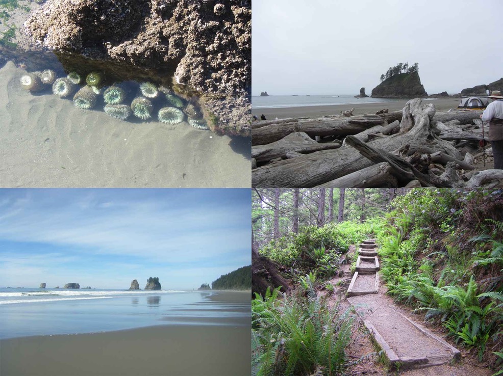 The parking lot and trailhead for imaginatively named Second Beach are on Quillayute land, but the trail quickly enters the national forest. The 3/4 mile trail passes through pretty coastal forest with wild old trees before descending to the Pacific Ocean. You can see the ocean through the screen of the forest before emerging at the beach where you will find yourself barricaded from the sand by an array of driftwood. This pile comes and goes with the tides, so you will have to clamber before reaching the sands.