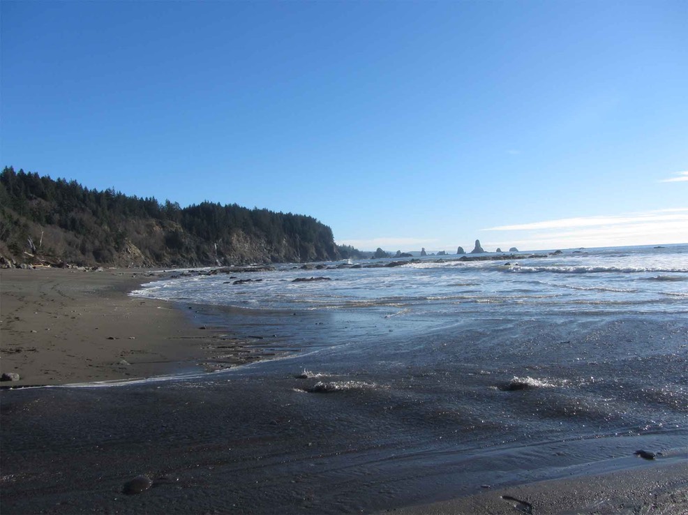 Follow the beach, explore the tide pools and admire the sea stacks. There is a waterfall at the far headland ahead. There is a headland trail if you are inclined to follow the coast south to Oil City near the mouth of the Hoh, but this is miles south. Instead, explore the tidepools and rocks at the base of the headland. There are anemones and starfish, though the latter were wiped out by disease in 2014. The word is that they are coming back.